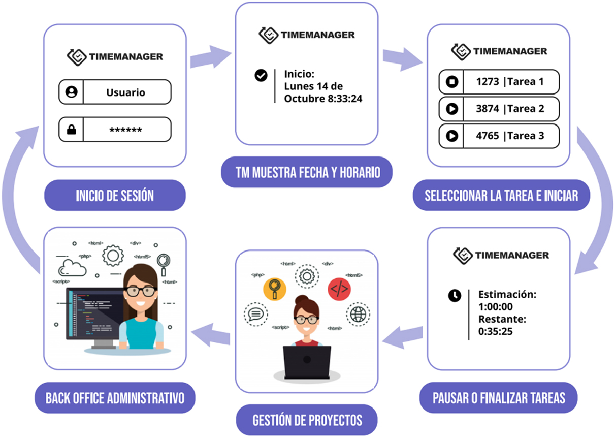 La herramienta Time Manager, posee un ciclo de trabajo muy completo, que comienza desde un inicio de sesión propio a cada usuario desde la versión "cliente" alojada en el Escritorio de la PC. Muestra fechas y horarios actuales al usuario, permitiendo posteriormente que el usuario seleccione la actividad que va a realizar, con un clic en "play" a la tarea a ejecutar.